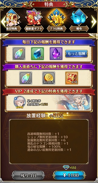 さらに、もっと確実に条件となるレベル110クリアを目指すなら「プライム特典(1,100円)」も課金しましょう。