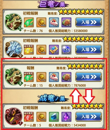レベルが低い時(レベル30から40)は星の数が7個か8個のドラゴンに挑戦しましょう。