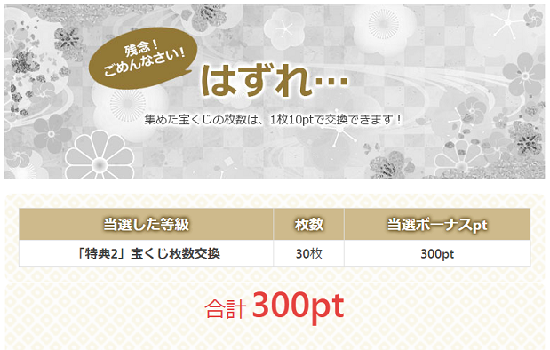 私は30枚の宝くじを持っていたので300ポイント(30円相当)が貰えます。