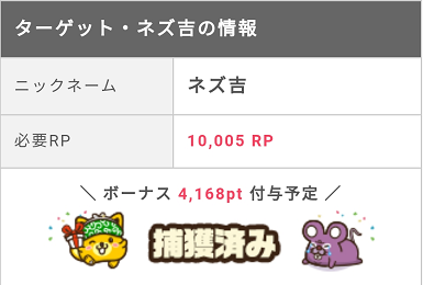 ネズ吉捕獲ボーナスは4,168ポイント(416円相当)となかなかの高ポイントなので、頑張ってポイント獲得条件をクリアしますよ。