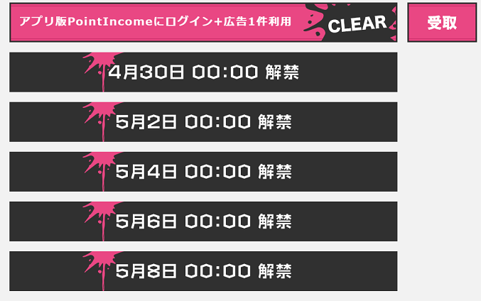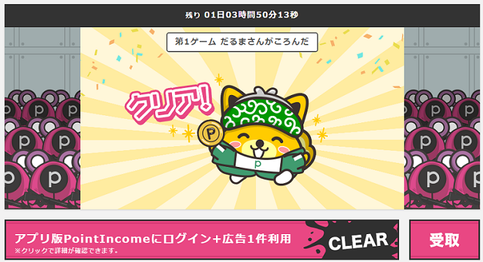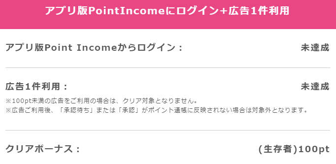内容は、アプリ版Point Incomeからログインと広告1件利用がゲームクリアの条件となっていました。