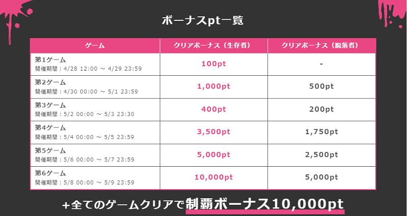 全てのゲームをクリアした者には制覇ボーナス10,000ポイント(1,000円相当)がプレゼントされます。