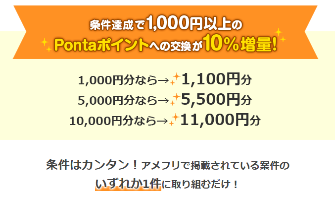 期間中にアメフリに掲載されている広告を1件利用することでPontaポイントへの交換が10%増量されます。