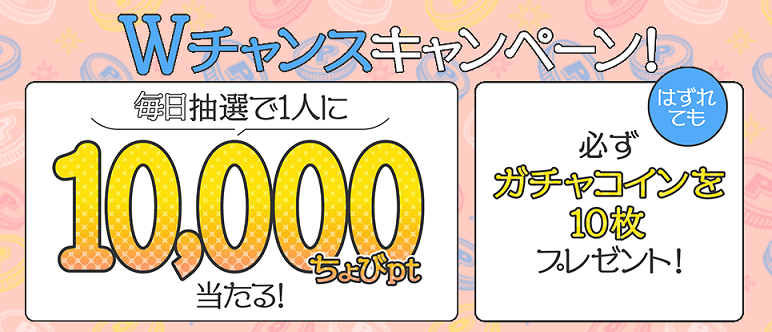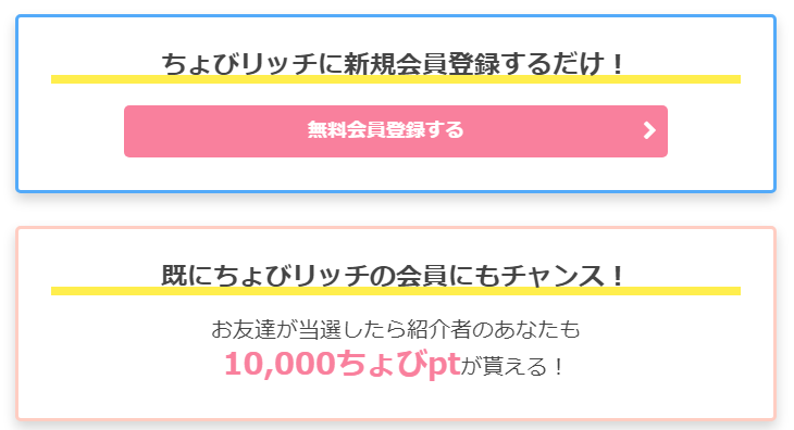 ポイントサイト【ちょびリッチ】では、期間中に新規会員登録すると毎日抽選で1名様に10,000ポイント(5,000円相当)が当たるキャンペーンが開催されています。