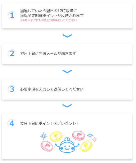 獲得予定明細ポイントが反映されます※6月末までに1pt以上の獲得をしてください - 翌月上旬に当選メールが届きます