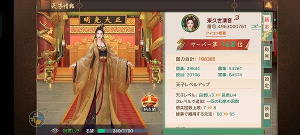 良く分かっていない状況でプレイを進めた結果、初日は国力19万まで進めることができました。