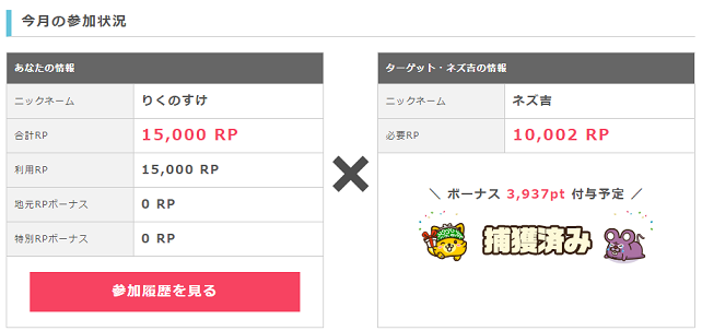 無事にネズ吉を捕獲でき、今月の捕獲ボーナスは3,937ポイント(393円相当)とまずまずのボーナスなので、頑張ってアイアム皇帝のポイント獲得条件をクリアしようと思います。
