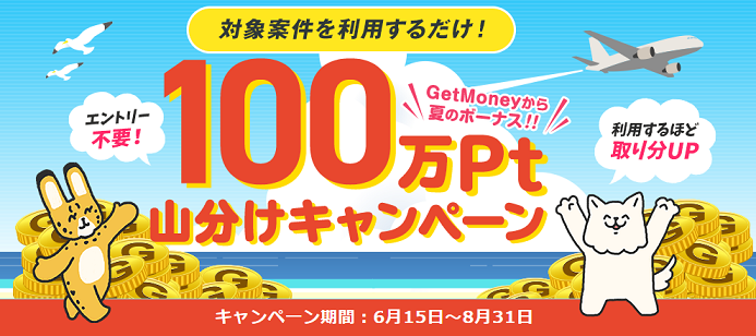 現在クローズドキャンペーンでお得に入会できるチャンスとなっている【GetMoney!】で対象案件を利用すると100万ポイント(10万円相当)山分けキャンペーンが開催されています。