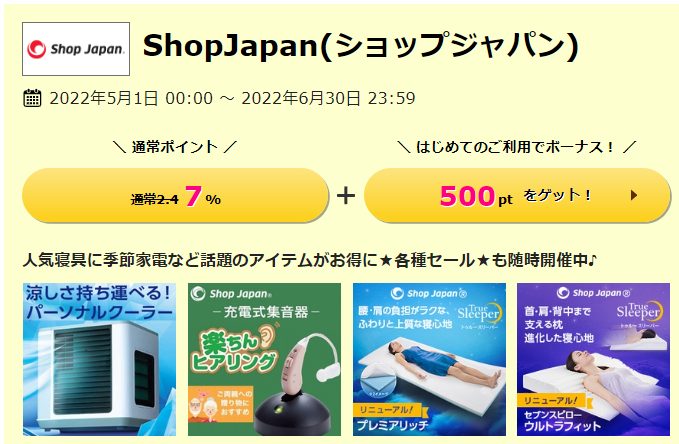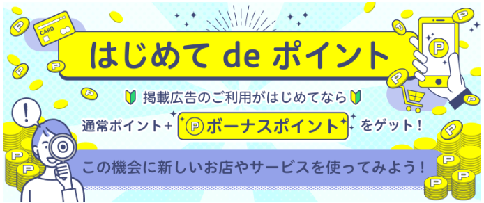 新しいショップやサービスを利用するとボーナスポイントがもらえる期間限定のキャンペーンです。 掲載ショップやサービスを利用したことがない方はボーナスポイントゲットのチャンス!