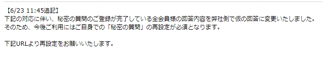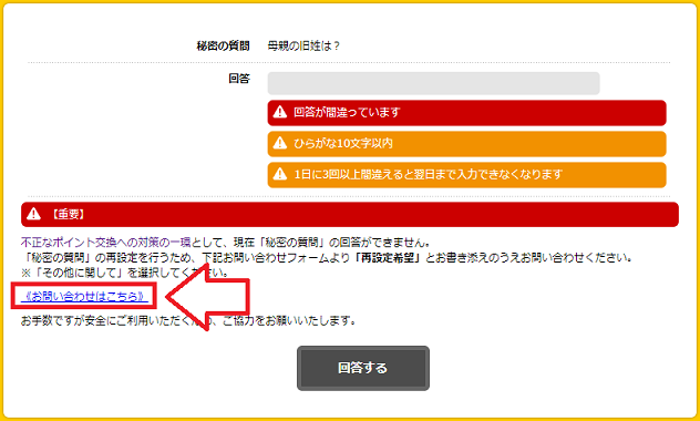 本来「秘密の質問再設定する」と表示されている箇所が「お問い合わせはこちら」となっていて再設定が簡単にできなくなっていました。