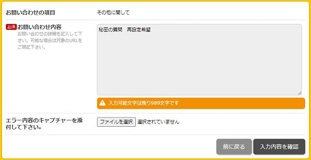 お問い合わせ内容に「秘密の質問 再設定希望」を入力して送信します。