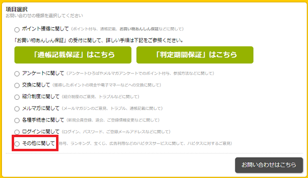 「お問い合わせ」ページの一番下の「その他に関して」を選択して「お問い合わせはこちら」をクリック。
