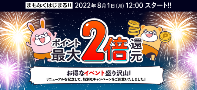 6月に予定されていた大リニューアルがスケジュールの都合で7月に変更になり2022年7月25日(月)20時~27日(水)正午頃のメンテナンスを境に大きく成長したポイントタウンへと進化を遂げます。