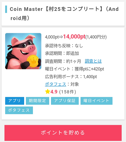 挑戦しているアプリは「CoinMaster」。このアプリは通帳に予定反映されないアプリで条件をクリアすることで即ポイントが付与されるアプリなので、25日までにクリアして通帳に記載されれば「全国ランキング-特別編-」をクリアできる予定です。多くの方は1週間かからずクリアしているアプリなので余裕を持ってクリアできると思っているんですがどうでしょうね。