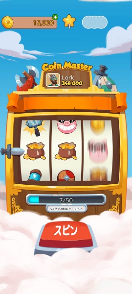 MAXは50ですが、イベントなどで入手した場合は大量にスピンを貯めることができます。放置で貯まるスピンの最大は50ですので、10時間ごとにまとめてプレイするのが効果的です。