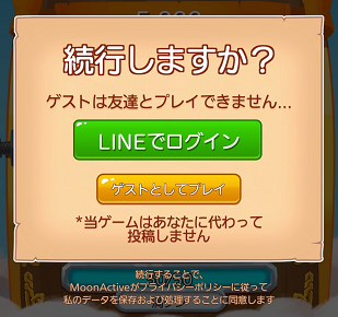 プレイ開始してすぐLINEでログインするか問われますが、「ゲストとしてプレイ」しましょう。