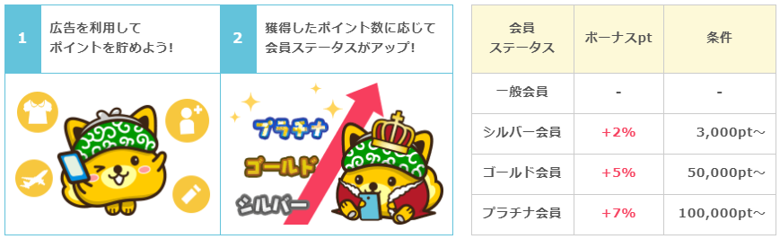 ランク制度(ステータス)のアップ条件は、案件(広告)利用での獲得ポイントの累計によって決定されます。