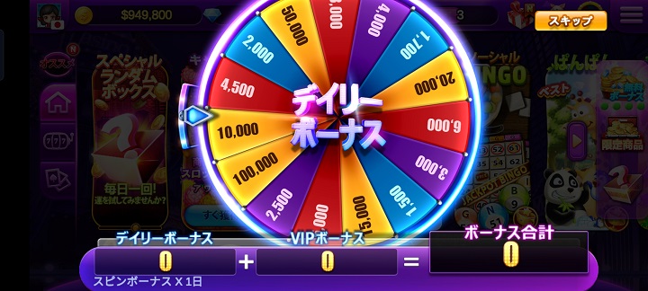 1時間ごとにコインがもらえ、5回コインを獲得するとWHEEL BONUSと言う少し多めにコインが貰えるルーレットにチャレンジできます。毎時間コインを受け取るのはちょっと大変ですが、少しでも時間を見つけたらちょくちょくログインしてボーナスをしっかりもらいましょう。