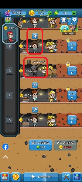 地中深く進めは進むほど1度の回収できるキャッシュも増えますが、レベル上げに必要なキャッシュも多くなるのでそんな時はマネージャーのスキル(レベルアップに必要なキャッシュ80%カット)を使って少ないキャッシュで最大限のレベルアップを心がけましょう。