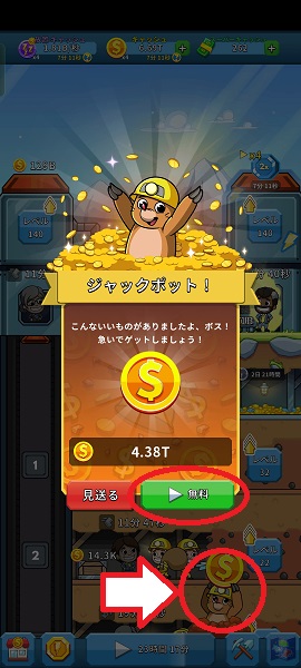 あとはプレイ中にちょいちょい顔をだす「もぐら」をタップすると動画視聴で結構なキャッシュがもらえるので、見つけたらタップして動画視聴しましょう。