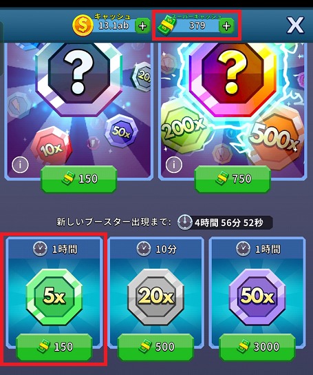 また、レベルアップなどで入手できる「スーパーキャッシュ」は貯めてもあまり使い道がない(2日間だけのプレイだから)ので、回収したキャッシュを倍に出来るブースターなどを購入しましょう。