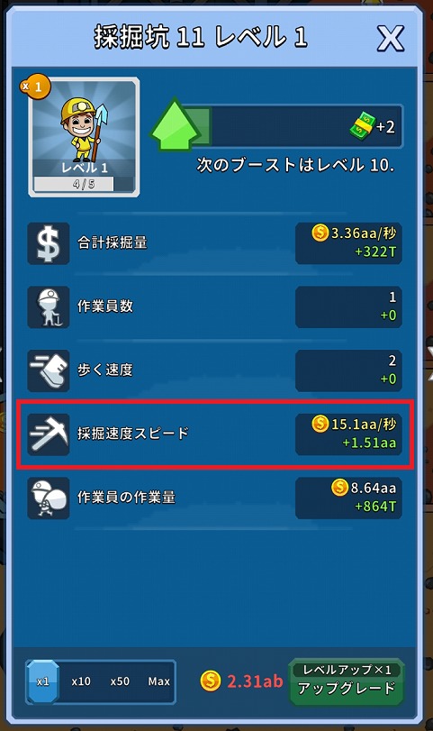 最終的に私は採掘抗11(深さ)まで進めました。11まで進めるとレベル1でも採掘速度が15.1aa/秒と滅茶苦茶キャッシュが貯まります。