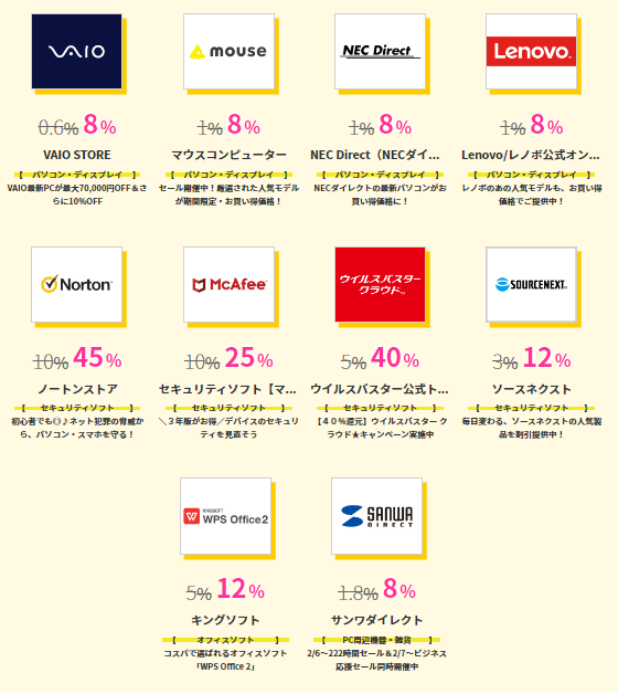 「ノートン」は45%。「ウイルスバスター」は40%還元とウイルスソフトは更新するよりも新規で購入した方が断然お得です。