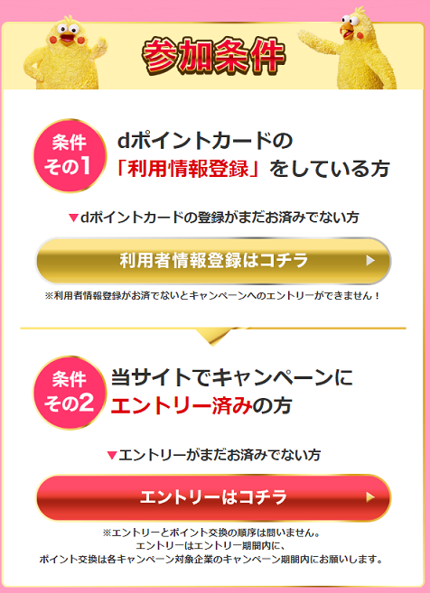 - 本キャンペーン対象企業のキャンペーン受付期間内に交換申込をいただき、キャンペーンサイトにて本キャンペーンのエントリー期間内にキャンペーンへのエントリーが正常に完了しているdポイントクラブ会員。