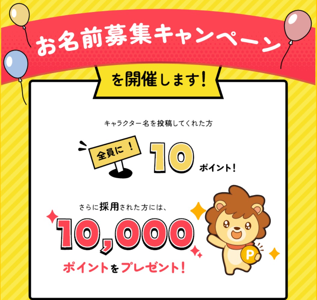 見事お名前が採用されると1万円相当のポイントがもらえます。センスのあるかたは応募してみましょう。