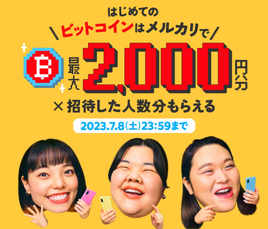 そんな、おすすめフリマアプリ【メルカリ】ですが、2023/07/08(土) 23:59までの限定でビットコインが最大2,000円分もらえる「はじめてのビットコインはメルカリで」が開催されています。