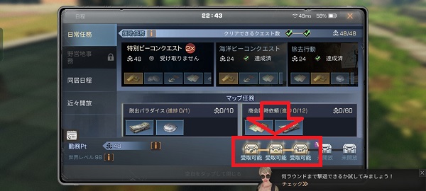 この任務は常に進むべき道しるべが表示されるので、迷う事はないし、時間的にも短時間で済みますので、ゲームを楽しむつもりは無いという方はひたすら毎日援助任務をクリアしましょう。