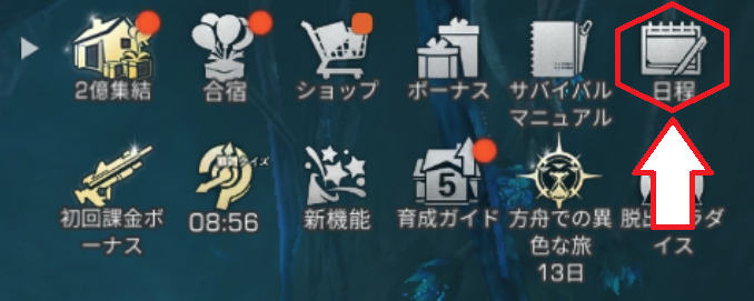 まずはサバイバルマニュアルを指示通りに進めて「日程」が開放されるまで進めましょう。