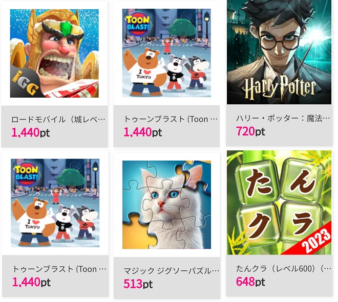 ハリーポッターや、マジックジグソーパズル、たんクラなんかはかなり簡単にポイント獲得条件に到達することができますので、挑戦してみてはいかがでしょうか?