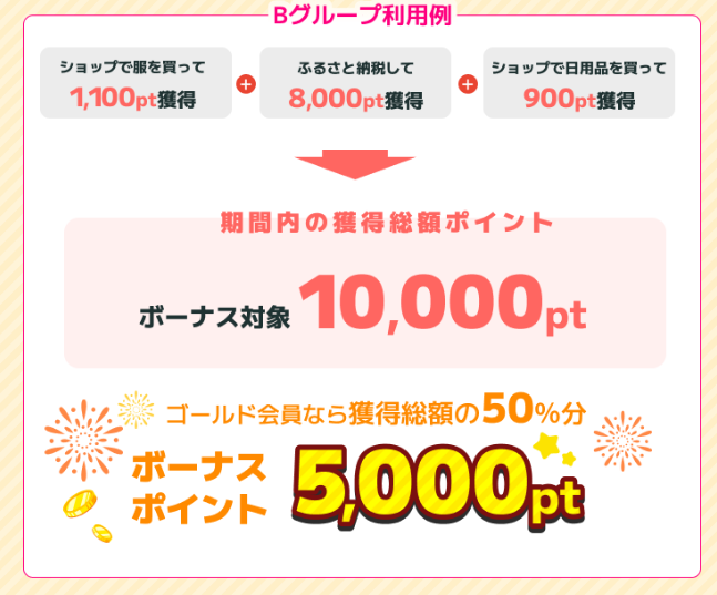 上の画像では、極端な例となっていますが、参考にはなると思います。要するに期間中にBグループに属する広告で10,000ポイント(10,000円相当)獲得すると、ゴールド会員なら獲得ポイントの50%にあたる5,000ポイントがボーナスポイントとしてプレゼントされます。