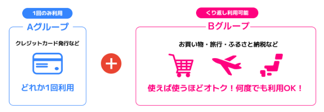 - Bグループの広告(お買い物・旅行など)を利用してポイントを沢山貯める