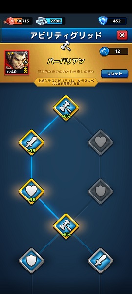 アビリティグリッドでは、英雄の「クラス」ごとにエンブレムを消費して強化を行ないますので、強化する英雄のクラスも分散させることでエンブレムを無駄なく消費しつつ英雄を強化することが可能ですが、そこまで拘らなくても地域12 ステージ1の周回プレイは可能です。
