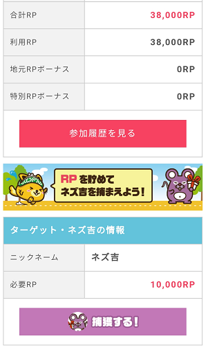 だいたい捕獲に必要なポイントは10,000ポイント(1,000円相当)となっています(15日の場合)。