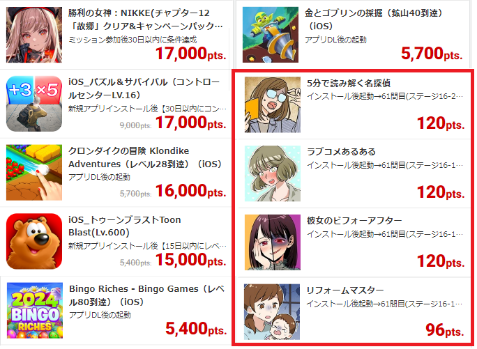 あとはポイントが少ないけど、比較的簡単なものに挑戦して数を稼ぐ方法はあり、コチラの方が私はおすすめです。