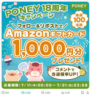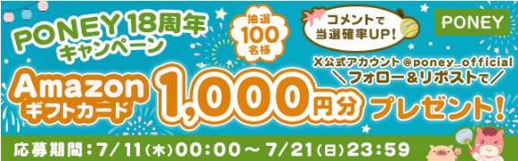 - PONEY公式Xフォロー・リポストでAmazonギフト1,000円!