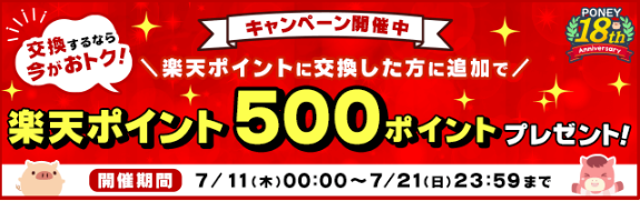 PONEYポイント650ポイント以上を楽天ポイントに交換した方に、追加で「楽天ポイント 500ポイント」をプレゼントいたします!