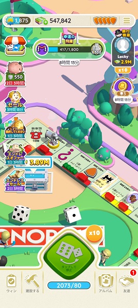 やることはサイコロを振る(自動)だけなのですが、銀行強盗などのイベントが発生するので、放置できないので、結構面倒なアプリでした。攻略要素も殆どないですからね。