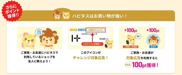 - 期間中にお友達がショッピング広告を利用して有効判定期限までに「有効」と記載されると100ポイント