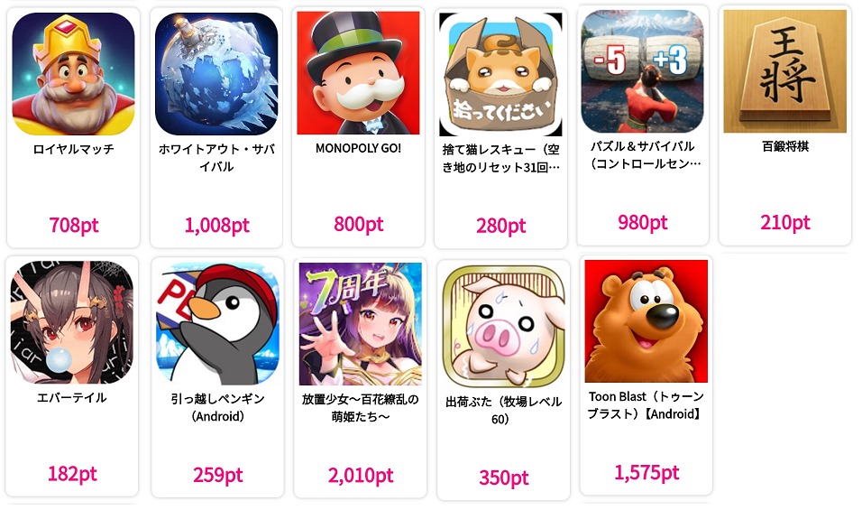 ゲームをプレイする必要がありますが、条件を達成(あるステージまで進む等)すると1,000円以上のポイントが貰えるアプリがハピタスには多数掲載されています。