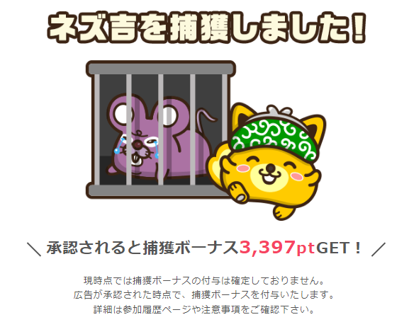 捕獲ボーナスは3,397ポイント(339円)と侮れないボーナスですよ。