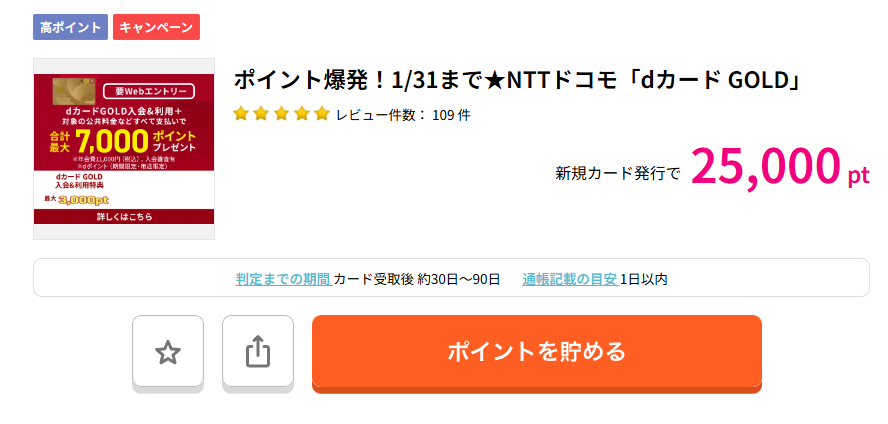 時期にもよりますが、ハピタスではdカード GOLDの発行で20,000円〜30,000円相当のポイントが還元されることも珍しくありません。年会費11,000円(税込)を差し引いても、お釣りがくる計算です。