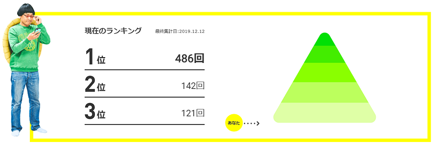 ユーザーはどちらかの派閥に分かれてランキングを争うので、選んだ派閥のランキングしか確認することができませんが、私が選んだカメ派のランキング上位のユーザーの広告利用回数が異常過ぎるほどヒートアップしています。