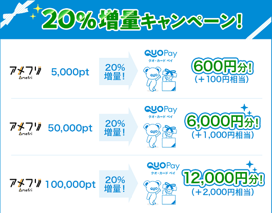 キャンペーン期間中、アメフリからQUOカードPayへのポイント交換がなんと20%増量!!!