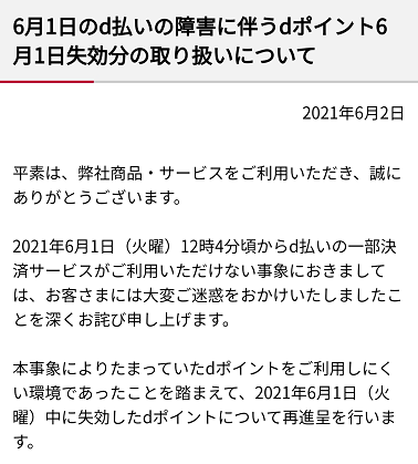 「6月1日のd払いの障害に伴うdポイント6月1日失効分の取り扱いについて」。