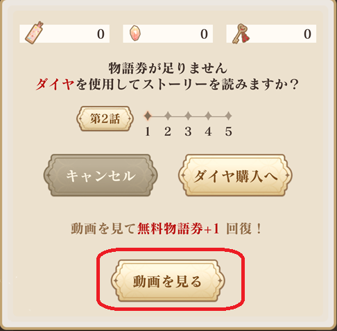 - 無料チケット(5枚)が無くなっても、動画視聴で1枚回復するので、早く条件をクリアしたい場合は、毎日視聴してチケットをGETしよう。